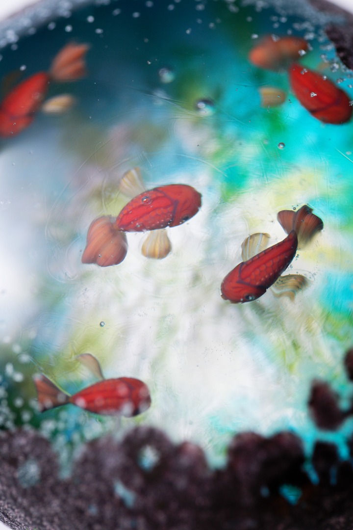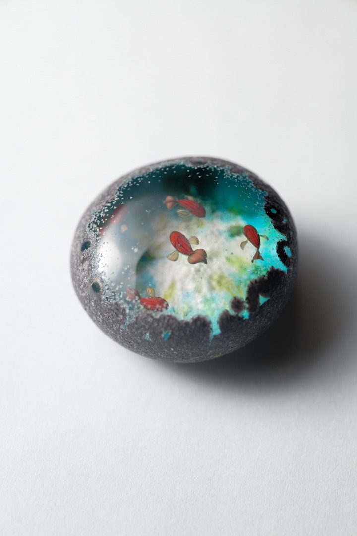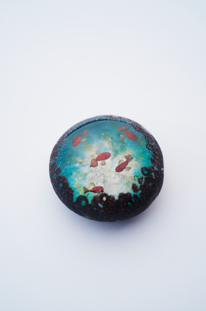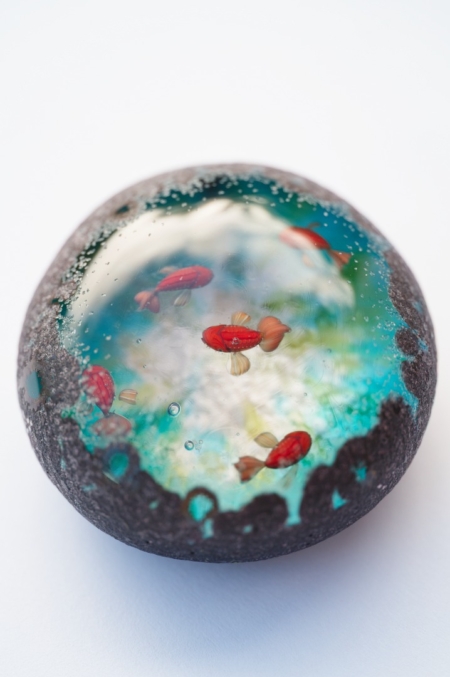 中に魚が棲んでいるという不思議な石「魚石」がモチーフの作品。