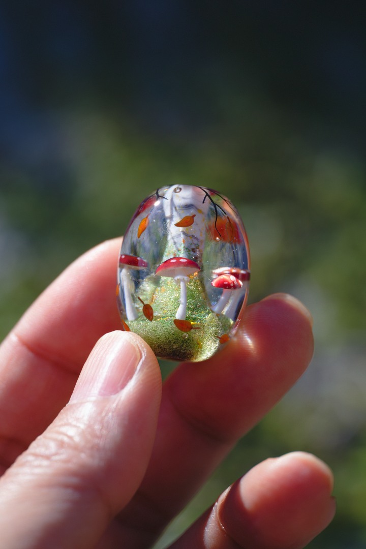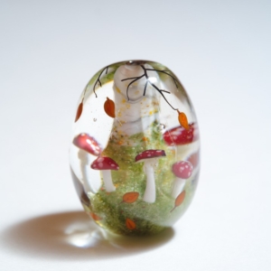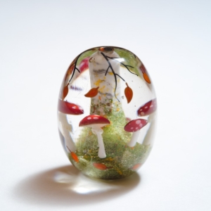 白樺の木の根元にベニテングタケ(成長したキノコ3本と若いキノコ2本)が生えている光景を記録した自然環境シリーズのトンボ玉作品です。
