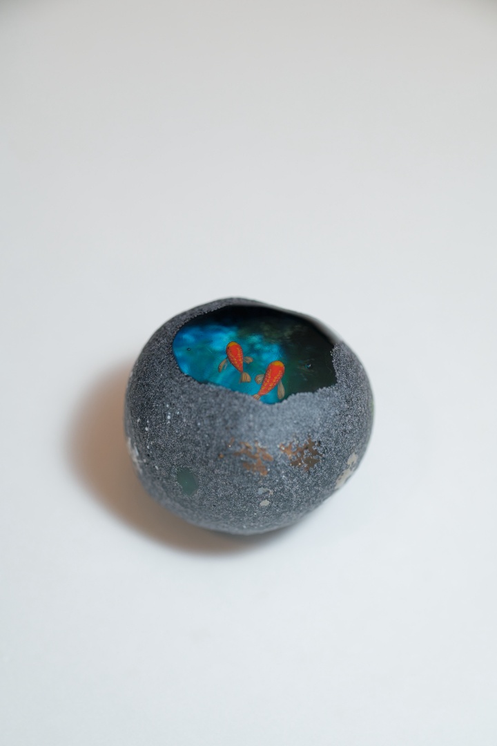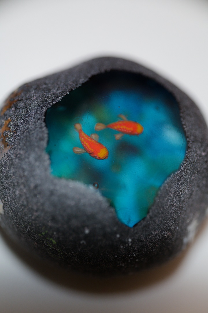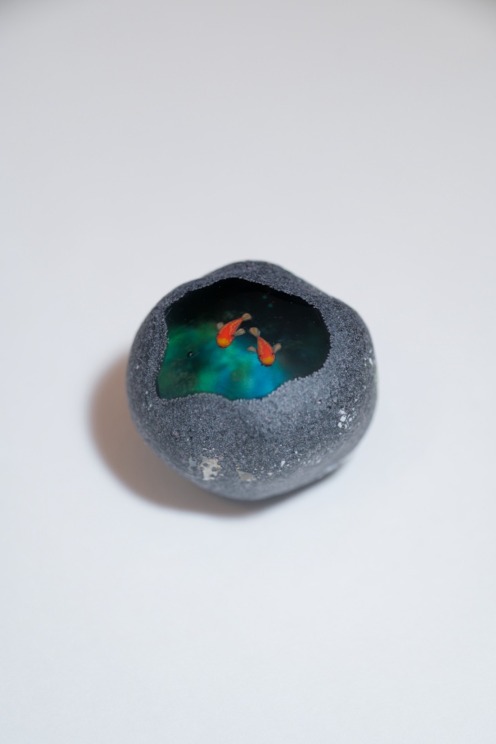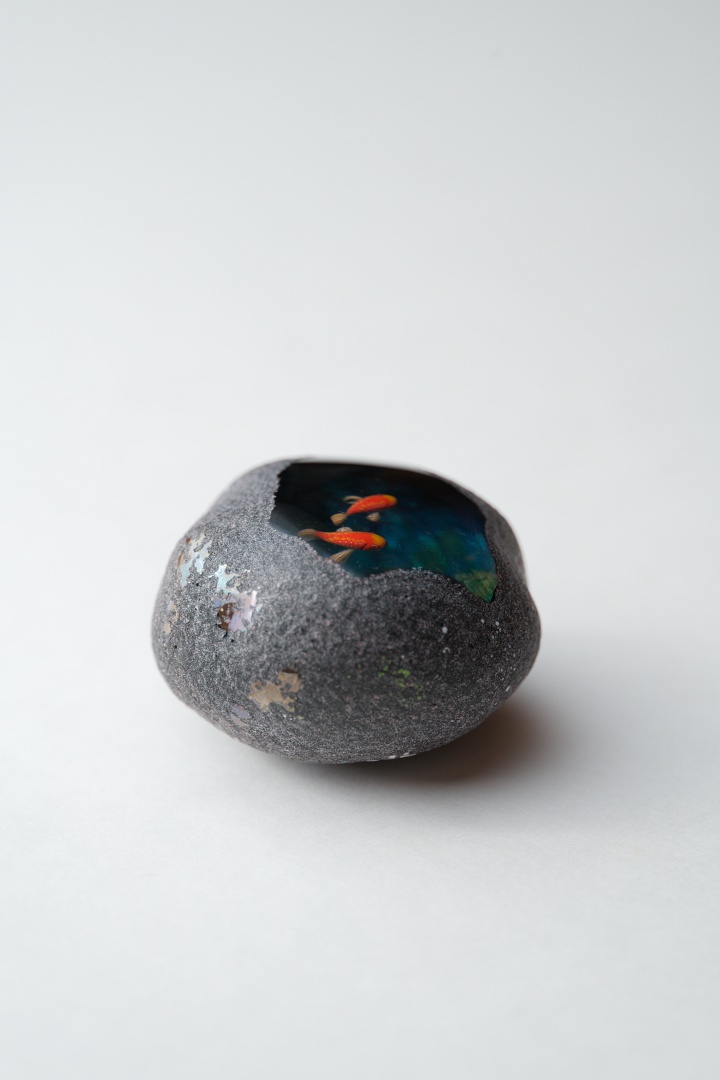 中に魚が棲んでいるという不思議な石「魚石」がモチーフの作品。