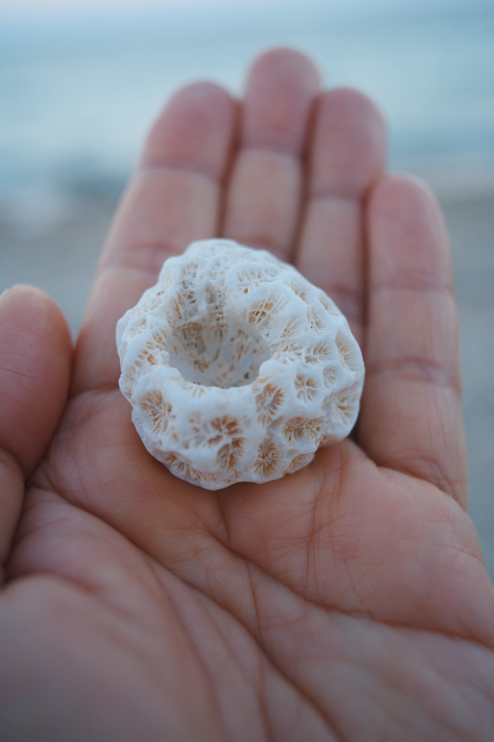 ↑先月、海岸で見つけたキクメイシ類の小さなサンゴ石。本作品のモデルさん。