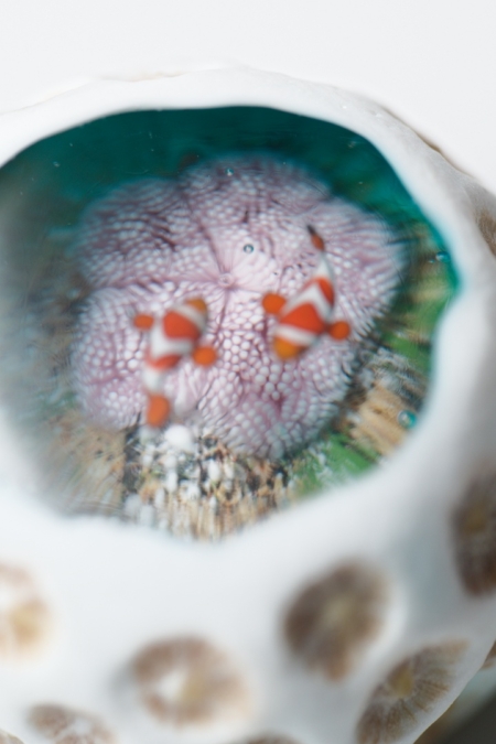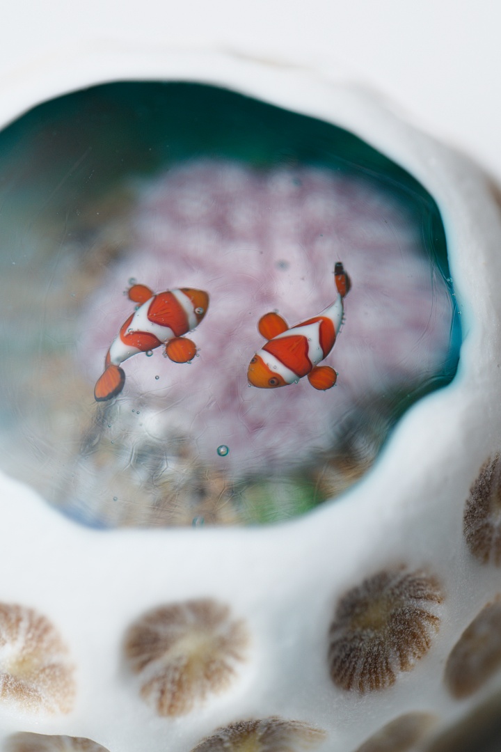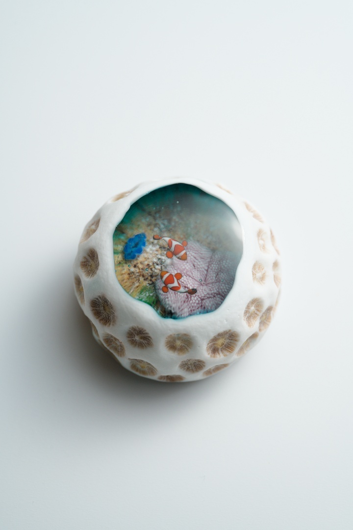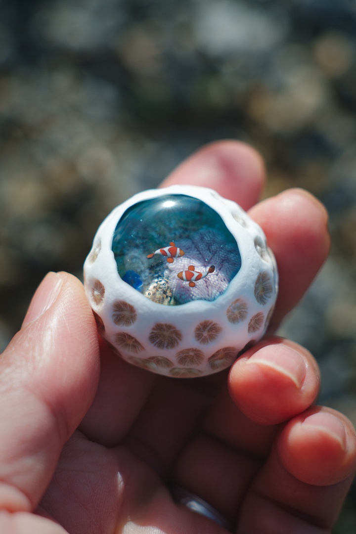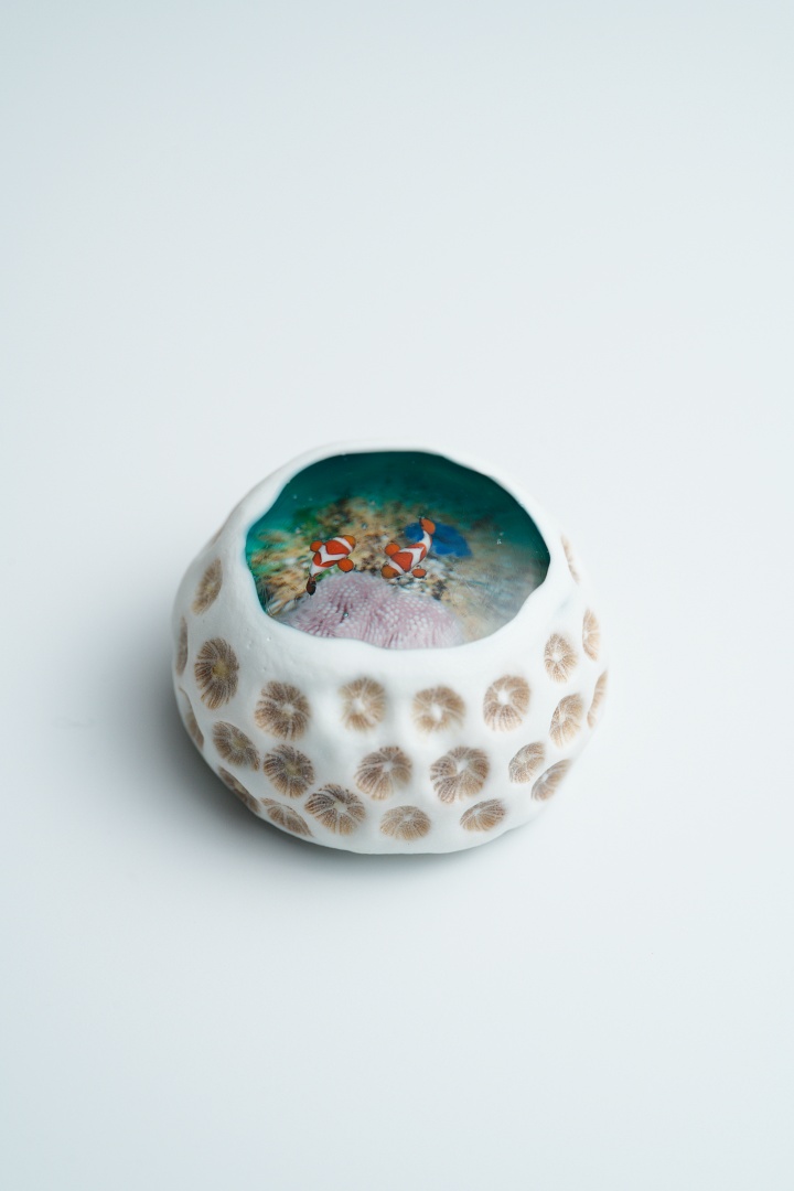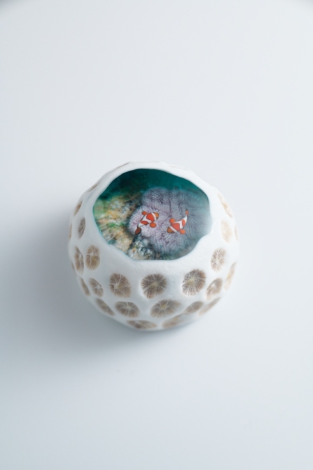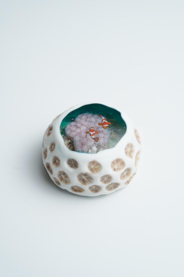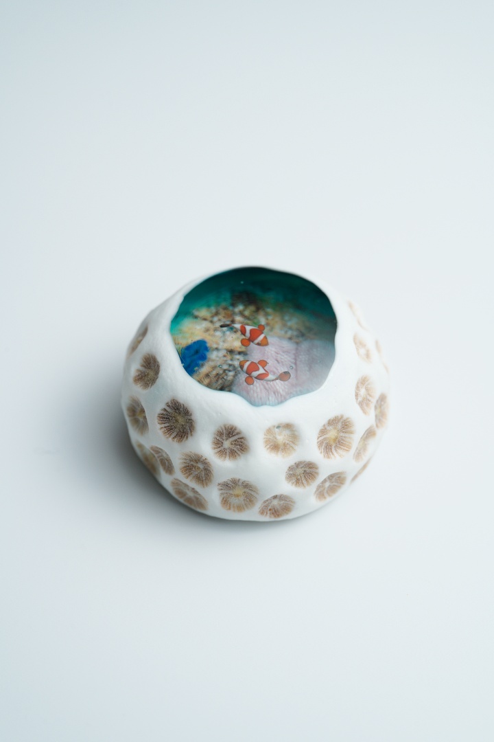 海岸に落ちている小さなキクメイシ類のサンゴ石に、ハタゴイソギンチャクとカクレクマノミ、ヒメジャコガイ等が暮らすマイクロアトールの景色を重ねて表現した作品です。
