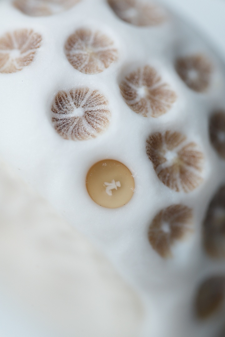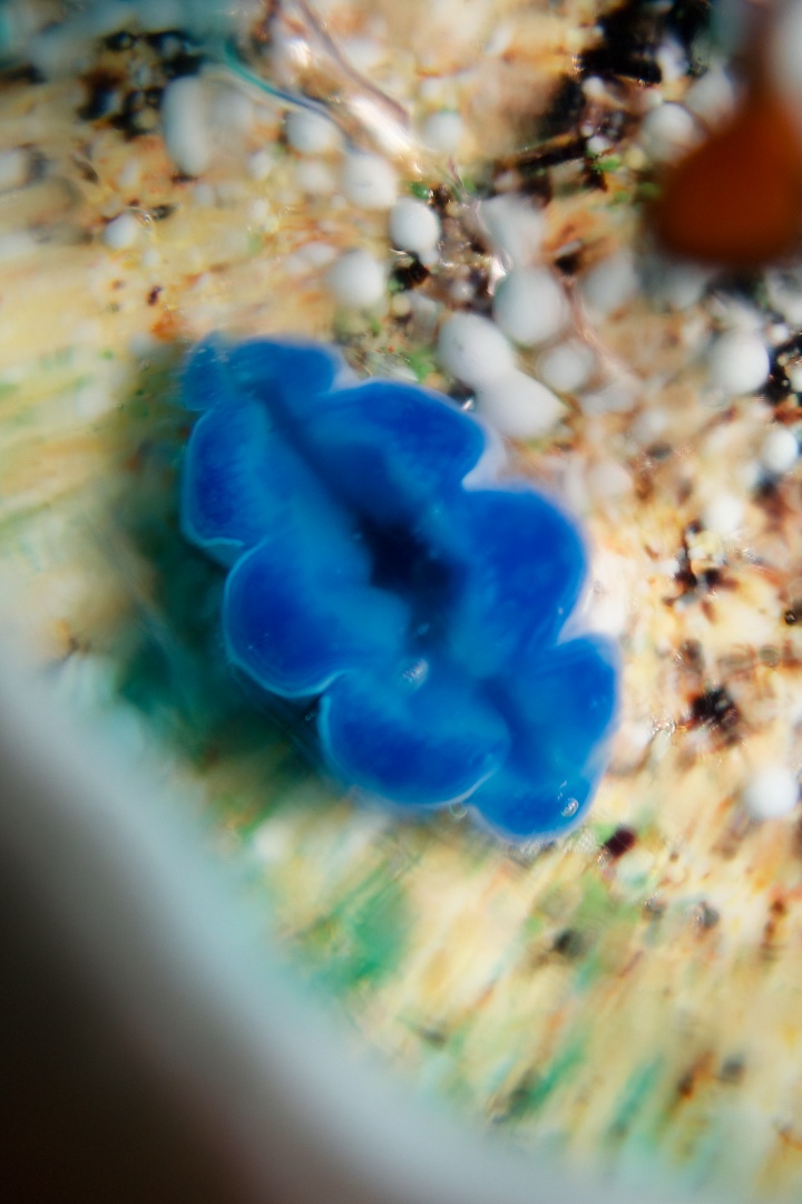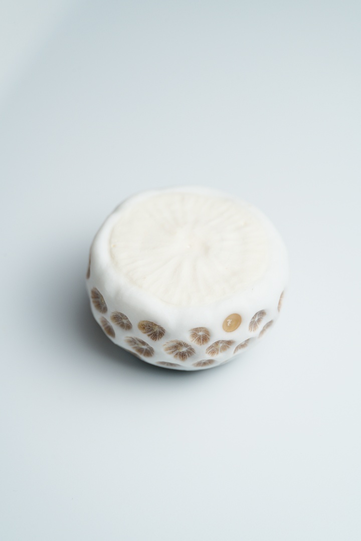 ちなみに、あの海を想うシリーズには同じくキクメイシ類がモチーフの「サンゴ石」というタイトルの作品たちが存在しますが、この「マイクロアトール」は「サンゴ石」系作品の中でも微環礁の住み込み連鎖をテーマにしたものということで特別なタイトルを付けています。