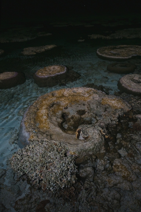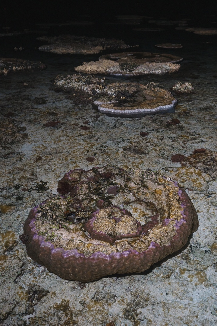 海岸付近のサンゴ礁では干潮時に、主にハマサンゴなどのマイクロアトールがあちこちに見られ、その内側の窪みにも様々な生き物たちが住み着いています。