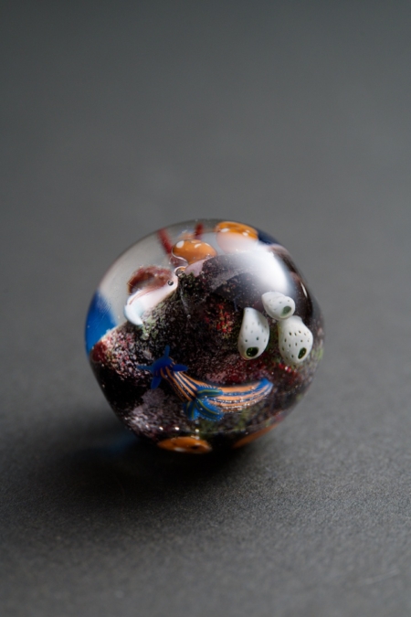 珊瑚礁の片隅で日常的に繰り広げられている食物連鎖の風景が直径28mmのガラス球の中に広がっています。