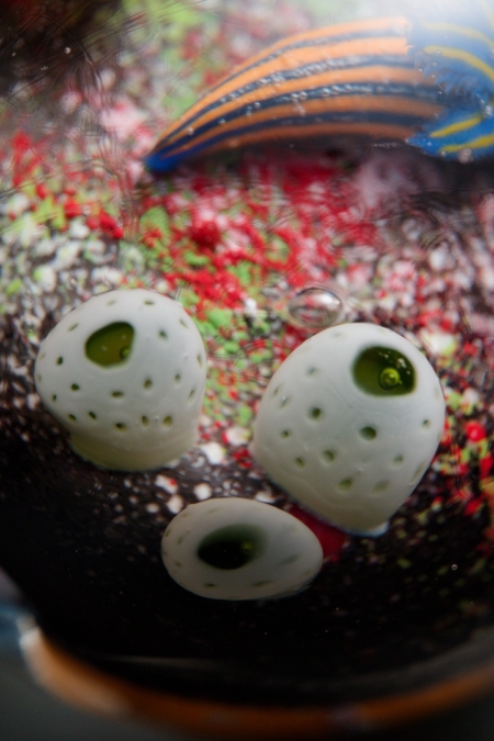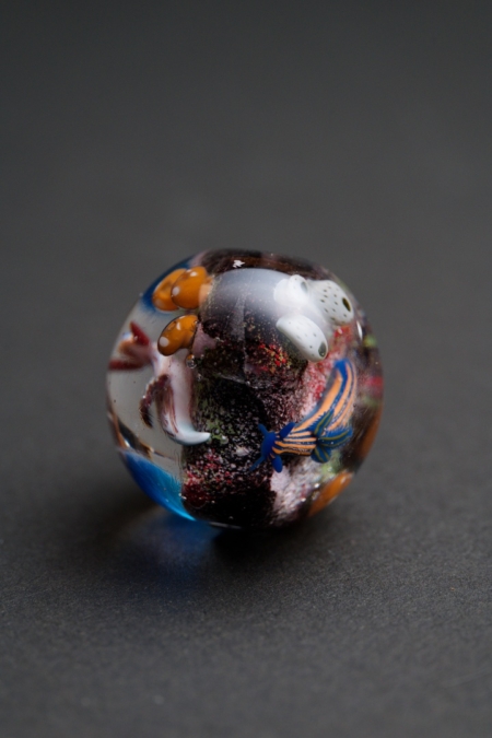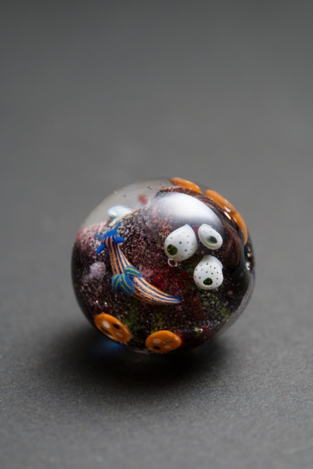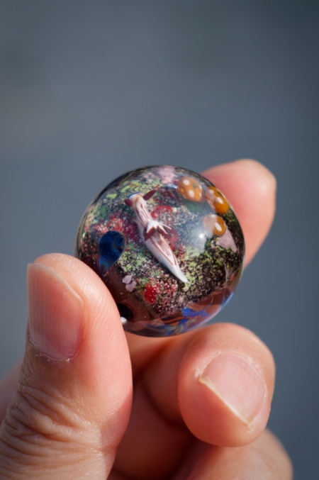 珊瑚礁の食物連鎖がテーマのトンボ玉で長年制作し続けている作品です。