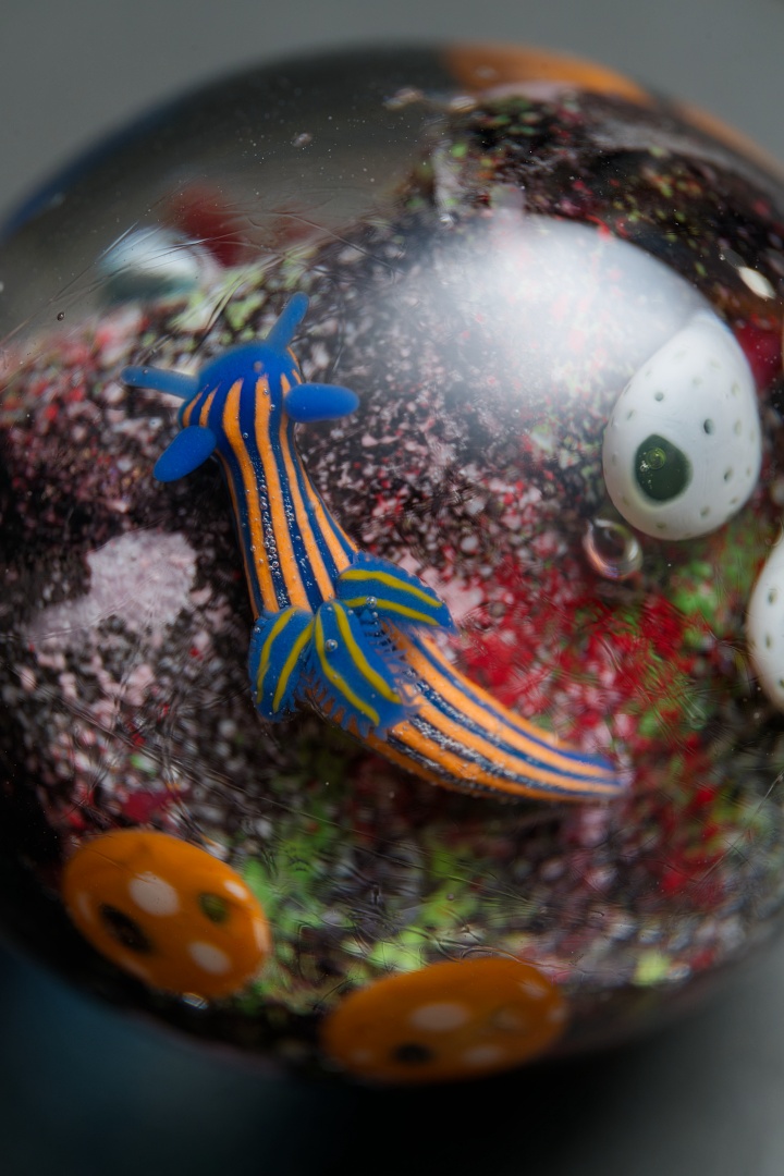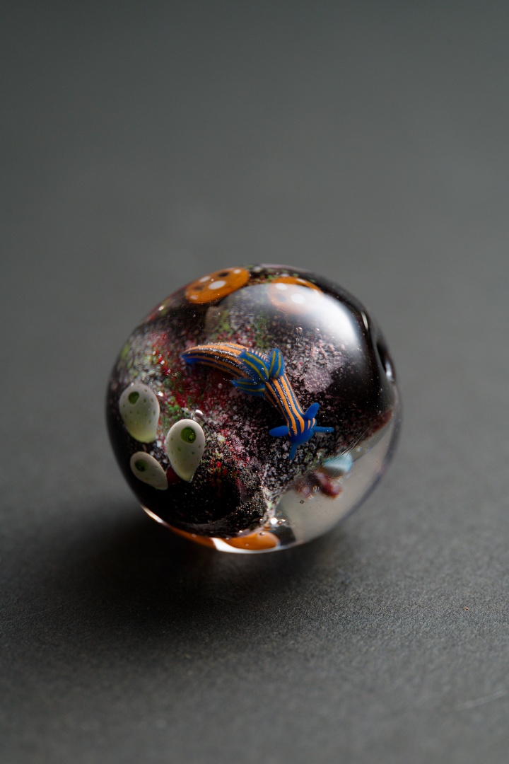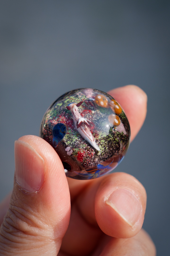 珊瑚礁の食物連鎖がテーマのトンボ玉で長年制作し続けている作品です。