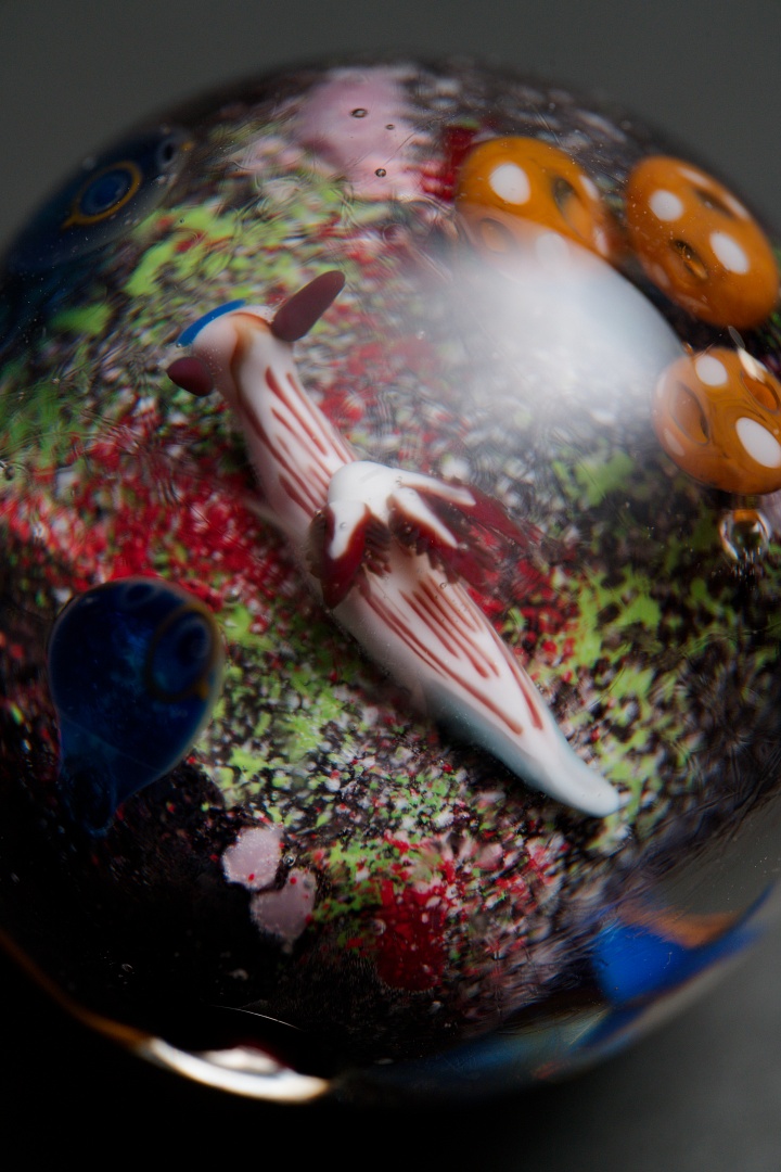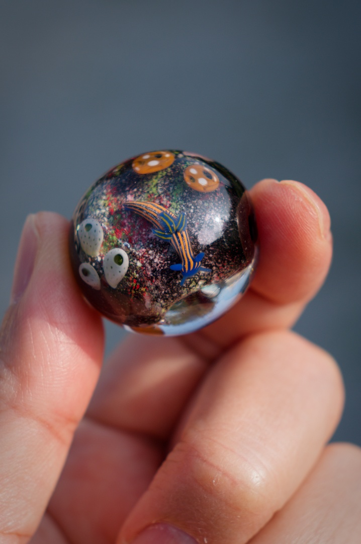 珊瑚礁の片隅で日常的に繰り広げられている食物連鎖の風景が直径28mmのガラス球の中に広がっています。