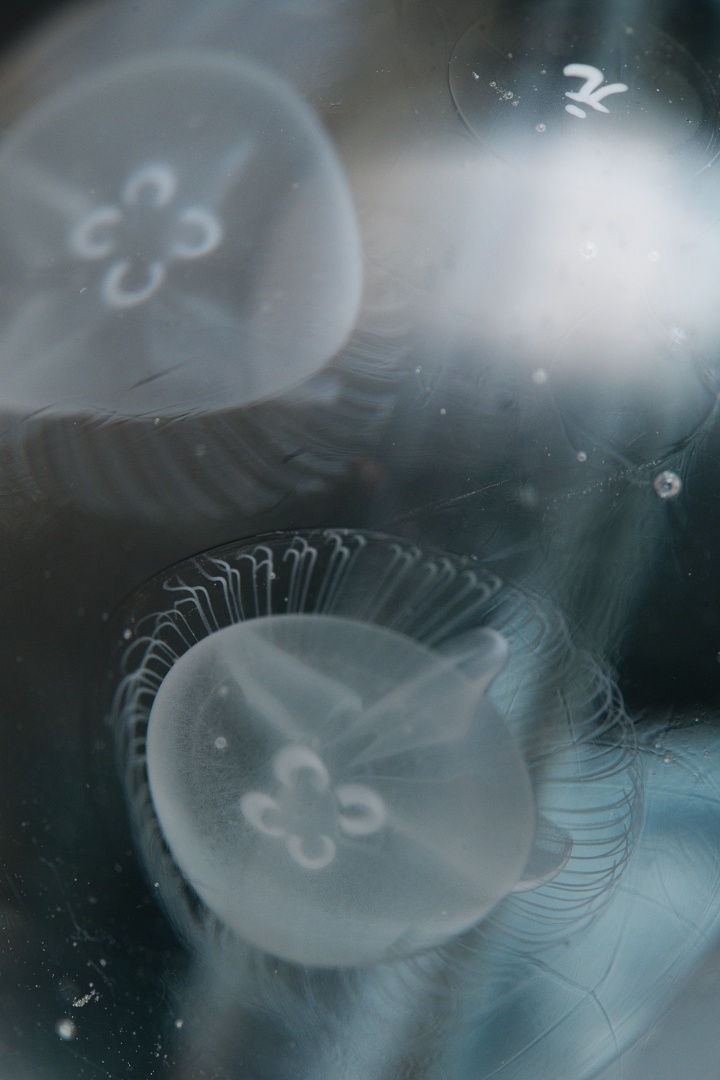 水球シリーズの共通イメージは「水中で浮遊生物が大量発生して生命が溢れる様子」で、この作品「水海月」は海中にあふれる無数のミズクラゲたちの生命感をシンプルに表現しています。