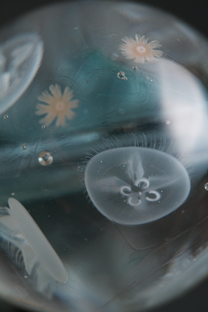 直径28mmのガラス球の中にミズクラゲ成体7匹、表面にはエフィラ幼生7匹が浮遊しています。